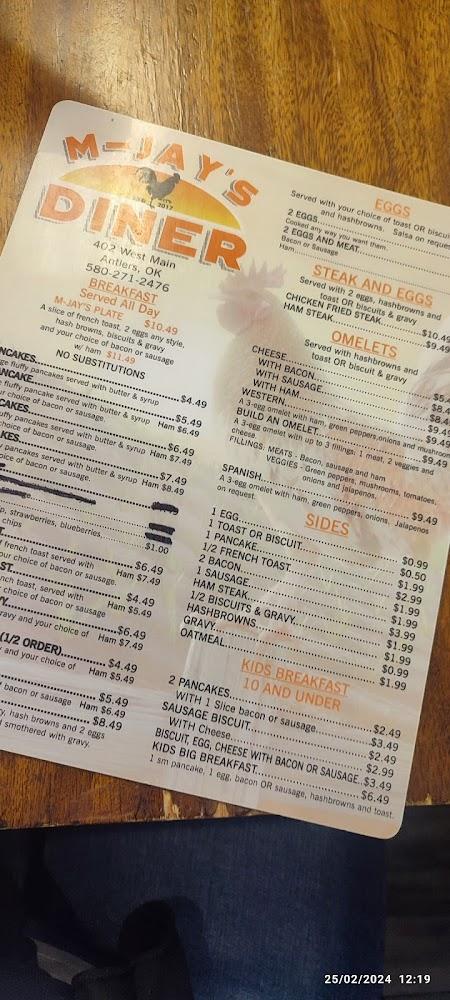 Welcome to MJay's Diner, your go-to spot in Antlers, OK, for a delicious and comforting dining experience. Located at 402 W Main St, we offer a delightful menu featuring breakfast, lunch, and dinner options, with an emphasis on local specialties. Enjoy our excellent coffee and shareable small plates in a relaxed, family-friendly atmosphere. We cater to everyone, with wheelchair accessibility, a children's menu, and convenient options for takeout and delivery. Whether you're stopping for a quick bite or settling in for a cozy dinner, MJay's Diner is the perfect place to savor great food and good company.